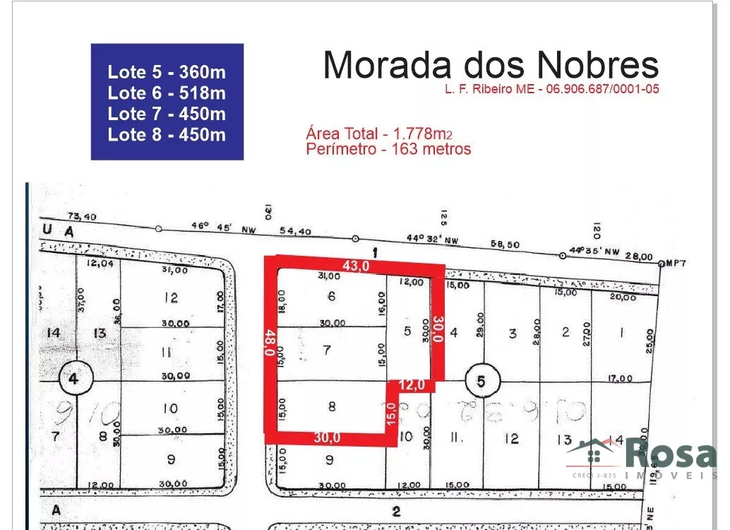 4 terrenos juntos no ponto mais alto do Bairro Morada dos Nobres, formando uma área total de 1.778m², vizinhança nobre, ao lado do Supremo Itália, Alphaville, Florais Itália, Jardim Itália, <br><br> ✅ Rua asfaltada e iluminada.<br><br> ✅ 320m² da Av das Torres.<br><br> ✅ Toda cercada, ideal para prédios, clínicas, supermercados, farmácias e diversos comercios.<br><br> São 4 terrenos. APENAS VENDA DOS 4.<br><br> Lote 5 - 360m²<br><br> Lote 6 - 518m²<br><br> Lote 7 - 450m²<br><br> Lote 8 - 450m²<br><br>