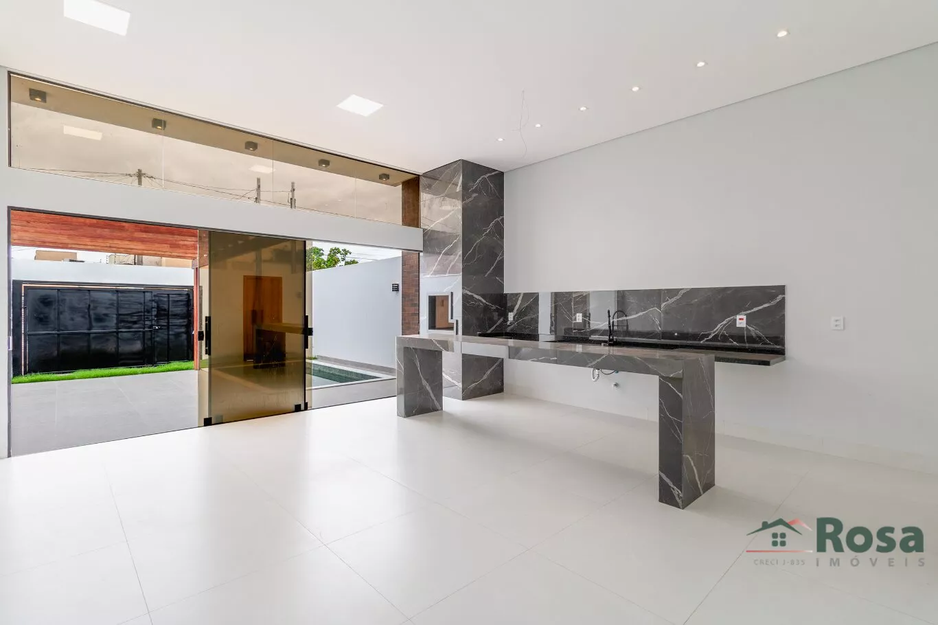 Casa Térrea com Piscina Recém-Construída à Venda no Bairro Jardim Universitário. O Imóvel Conta com 3 Quartos, Sendo 1 Suíte com Closet, 1 Banheiro Social, Lavanderia Coberta, Cozinha e Sala Integradas com Churrasqueira e Pé Direito Alto. A B