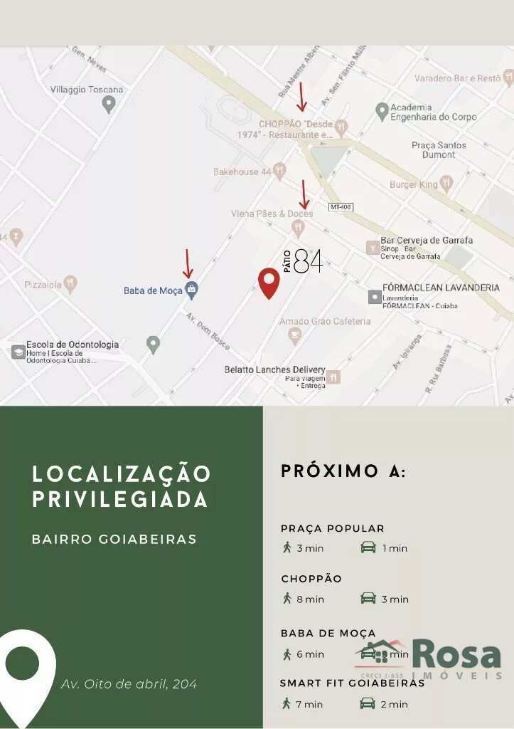 Apresentamos a mais recente adição ao cenáriocomercial de Cuiabá: lojas exclusivas no Goiabeiras , obairro mais prestigiado . Este espaço de 100 m² ofereceambiente sofisticado para negócios, com qualidade na construção e atmosfera cuidadosamente projetada. Localização estratégica para visibilidade, estacionamento próprio para comodidade. Se buscaum espaço para sua visão empreendedora, explore estaoportunidade. Este documento detalha o espaço, suascaracterísticas e possibilidades. Junte-se a nós nacriação de um novo capítulo no comércio de Cuiabá. 60 m² térreo40 m² mezanino100 M² Total Segurança:Portão de enrolar automatizado;Vitrine de vidro;Câmeras de vigilância* WC1 instalação completa;1 espaço reversível. Copa:com bancada de granito Piso:Inferior em porcelanato;Superior (mezanino) em pisowall. Ar condicionado:Infraestrutura pronta para instalação Área Externa:Com tanque;Área técnica para instalação de condensadores dos splits. Internet:Rede fibra ótica pré-instalada**Fornecido pela empresa QEST Tecnologiaem caso de contratação PRAÇA POPULAR3 min ??1 min ? CHOPPÃO8 min ??3 min ? BABA DE MOÇA6 min ??5 min ? SMART FIT GOIABEIRAS7 min ??2 min ?